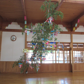 ≪七夕まつり≫2024年7月16日読了時間: 1分更新日:2024年7月24日7月7日は七夕の日。プレイルームに置かれた3本の笹に各学年ごとに飾りつけをしました。自分たちで作った笹飾りや「願いごとが叶いますように」と心を込めて短冊に飾り、最後はうめ組全員で作った輪飾りを付けました。大きな笹が持ち上げられ飾られると、自分たちより何倍もの高さになった笹に驚き、ゆらゆら揺れている笹飾りに大喜びの子どもたちでした。