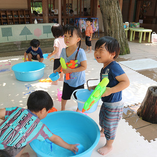 ずっと楽しみにしていた水遊び。水鉄砲やバケツ、水車、それから海の生き物すくいなどが用意されていて、どれから遊ぼうかと悩んでしまうくらい大興奮だった子どもたち。水鉄砲では、木に向かって水を飛ばしたり、友達とどちらが遠くに水を飛ばすことができるかを競い合い楽しみ、海の生き物すくいでは、色々な生き物を上手にポイですくっていました。バケツにたっぷり水を入れ、頭から水をかぶり「気持ち〜!」と笑顔を見せる姿もあり、元気いっぱい水に触れることを楽しんでいました。「水遊びやるよ!」と伝えると目を輝かせて大喜びの子どもたちでした。