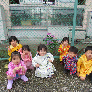 雨が降ると「今日はいける?」と目を輝かせてワクワクする子どもたち。自分のレインコートや長靴の模様を嬉しそうに見せ合いながら着替える姿がありました。蕾だった紫陽花が次の日に行くと花が咲いている小さな変化や匂いの違いなどにも気付いてみんなで嬉しそうに報告し合ったり、カタツムリを見つけると興奮しながらも「優しく触ってあげよう!」と声を掛け合う姿がありました。雨の中、外へ行ける喜び、様々な発見ができた嬉しさがあるなかでも話をよく聞いたり、声を掛けるとすぐ並んだりとうめ組らしい姿もみることが�できました。