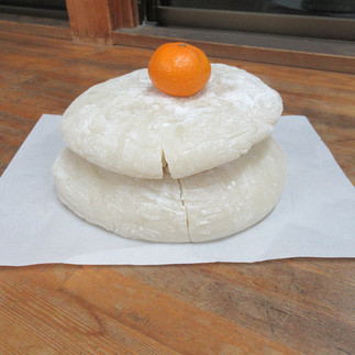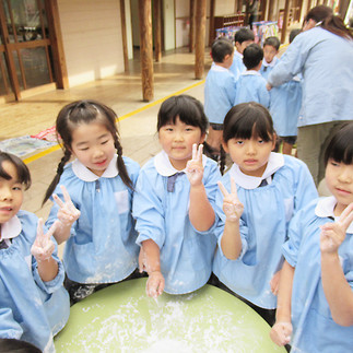 楽しみにしていたおもちつきに朝からワクワクしていた子どもたち。教室では、鏡餅の由来やお餅つきに使う道具の名前について夢中になって聞いていました。杵や臼を見ると、目を輝かせながら自分の順番を待ち、いざやる時には杵をぎゅっと持って力いっぱいおもちをついていました。みんなでつきたてのおもちを触ると、「あったかいね」「柔らかいなぁ」と言って感触を楽しむ姿も見られました。友だちと力を合わせて丸い形を作ることができ、教室に飾ると「かたくなったね」「みかんがのってる!」と自分たちが作った大きな鏡餅に大満足の子どもたちでした。